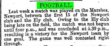 The first Cardiff match was played on Dec 2nd1876 at Newport and this was the first match that admission was charged at 6d (2.5p). Hereford arrived at Newport for the third match short and Newport loaned them 5 players. Newport scored 4t to 1g, 1t in a 12-aside match which was then regarded as a 0-0 draw.