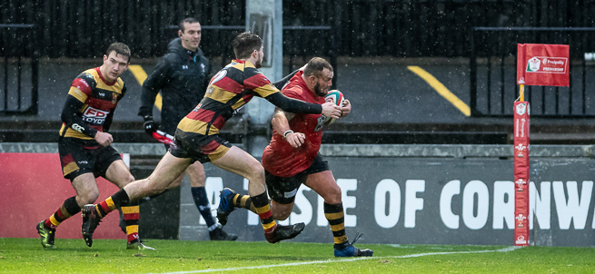 The introduction of Ryan James at halftime promised to be an inspired move. These were the conditions in which James’ attritional game might thrive. The decision paid off within three minutes after James had taken a series of quickly taken penalties, pushing Newport within touching distance of the Quins line. A blockbusting run by Rhys Jenkins was tackled short as play carried on with advantage to Newport. Inspired by James, Matt O’Brien took a quick tap and tried to make the wet surface work for him by sliding in. He was held up short but drew enough cover to open a gap for Ryan James to find Joe Bartlett barrelling through for Newport’s opening score. The conversion sailed to the right of the posts to make the score Newport 5 Quins 8 on 43 minutes.